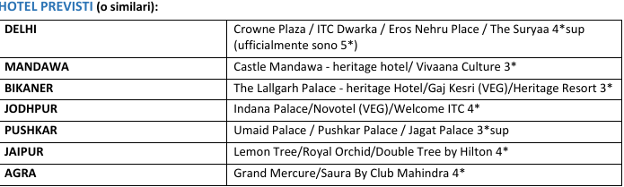 - Trattamento di pensione completa, dal pranzo del 2° giorno alla prima colazione del 11° giorno, bevande escluse; è prevista una cena speciale sulle dune a Bikaner;